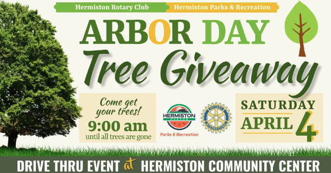 The free annual Arbor Day Tree Giveaway, hosted by the Hermiston Parks and Recreation Department and the Hermiston Rotary Club, is set for this Saturday, April 4 at 9 a.m. in the Hermiston Community Center parking lot.