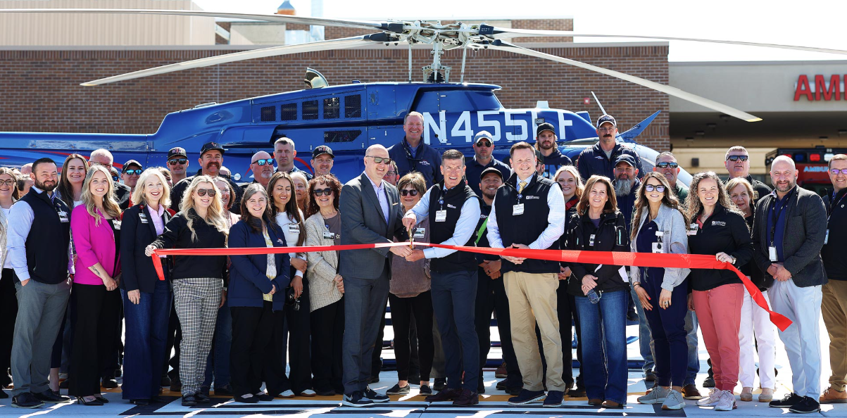 Life Flight Network CEO Ben Clayton and GSHCS President and CEO Art Mathisen cut the ribbon at the new Life Flight Hangar on the GSHCS campus on April 17
